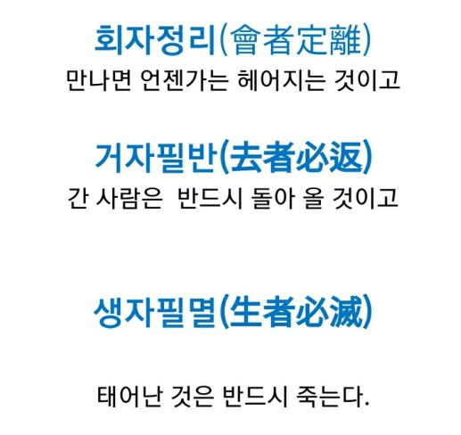 만나면 헤어지고, 떠난 사람은 돌아오며, 태어난 것은 반드시 죽는다.