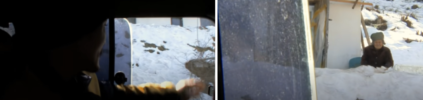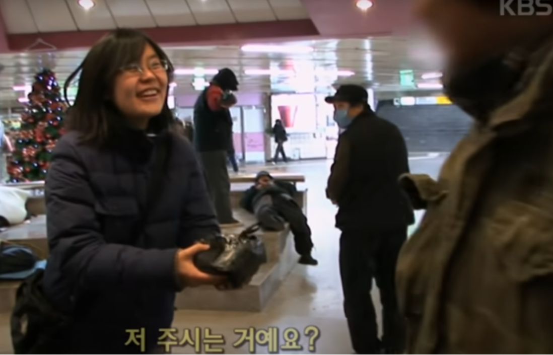 그 것을 촬영진들에게 나누어 주는 노숙자들. 촬영에 비협조적이던 2주만의 일이다.